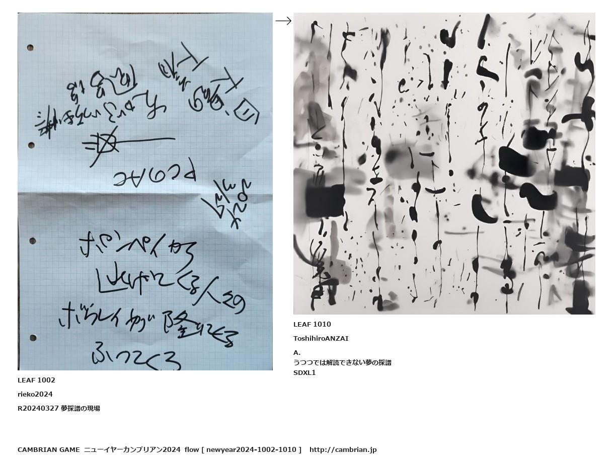 LEAF 0196フローに加えるLEAF 1002rieko2024R20240327 夢採譜の現場 ↑ここから上をフローから外す↓ここから下をフローから外すLEAF 1010ToshihiroANZAIA.うつつでは解読できない夢の採譜SDXL1LEAF 1052フローに加える