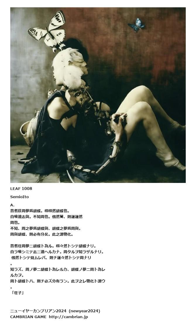 LEAF 1002フローに加えるLEAF 1008SemioItoA.昔者莊周夢爲胡蝶。栩栩然胡蝶也。自喩適志與。不知周也。俄然覺、則蘧蘧然周也。不知、周之夢爲胡蝶與、胡蝶之夢爲周與。周與胡蝶、則必有分矣。此之謂物化。昔者荘周夢ニ胡蝶ト為ル。栩々然トシテ胡蝶ナリ。自ラ喩シミテ志ニ適ヘルカナ。周タルヲ知ラザルナリ。 俄然トシテ覚ムレバ、則チ蘧々然トシテ周ナリ。知ラズ、周ノ夢ニ胡蝶ト為レルカ、胡蝶ノ夢ニ周ト為レルカヲ。周ト胡蝶トハ、則チ必ズ分有ラン。此ヲ之レ物化ト謂ウ。「荘子」
