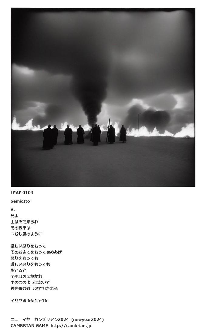 LEAF 0092フローに加えるLEAF 0103SemioItoA.見よ主は火で来られその戦車はつむじ風のように激しい怒りをもってそのおきてをもって褒めあげ怒りをもっても激しい怒りをもってもおこると全地は火に焼かれ主の霊のようにないて神を恨む者は火で打たれるイザヤ書 66:15-16LEAF 1047フローに加えるLEAF 0790フローに加えるLEAF 0178フローに加える