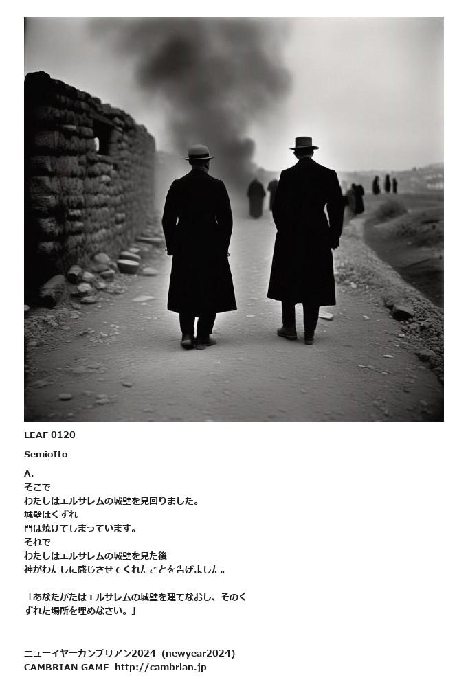 LEAF 0102フローに加えるLEAF 0120SemioItoA.そこでわたしはエルサレムの城壁を見回りました。城壁はくずれ門は焼けてしまっています。 それでわたしはエルサレムの城壁を見た後神がわたしに感じさせてくれたことを告げました。「あなたがたはエルサレムの城壁を建てなおし、そのくずれた場所を埋めなさい。」LEAF 0171フローに加える