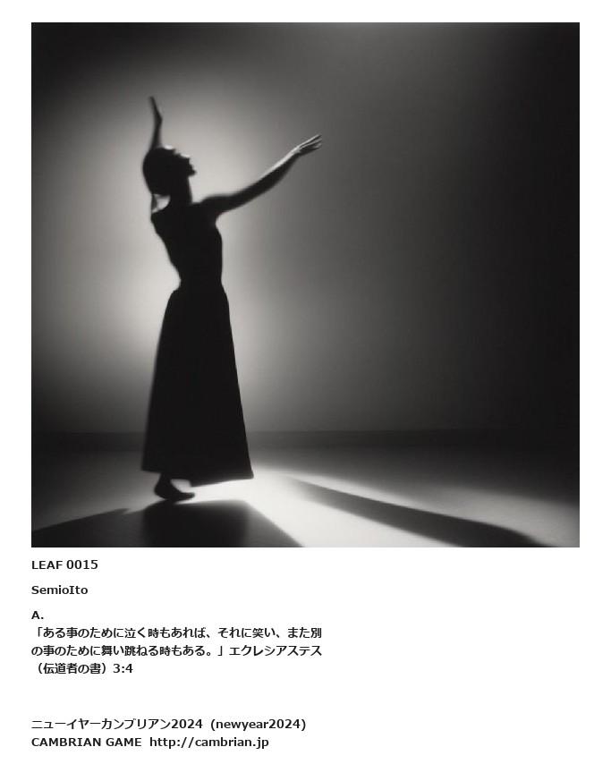 LEAF 0006フローに加えるLEAF 0015SemioItoA.「ある事のために泣く時もあれば、それに笑い、また別の事のために舞い跳ねる時もある。」エクレシアステス(伝道者の書)3:4LEAF 0215フローに加えるLEAF 0024フローに加える