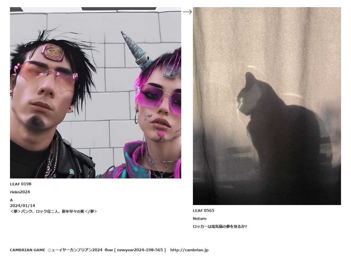 LEAF 0190フローに加えるLEAF 0198rieko2024A2024/01/14<夢>パンク、ロックな二人、新年早々の客</夢>↑ここから上をフローから外す↓ここから下をフローから外すLEAF 0565Netaroロッカーは電気猫の夢を見るか?LEAF 0573フローに加える