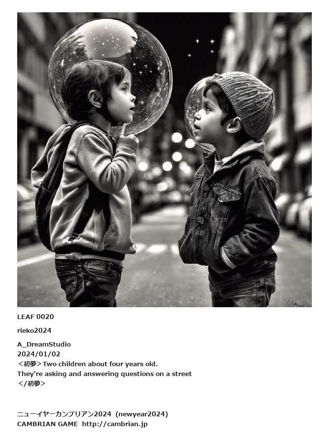 LEAF 0003フローに加えるLEAF 0020rieko2024A_DreamStudio 2024/01/02<初夢>Two children about four years old.They're asking and answering questions on a street</初夢>LEAF 0153フローに加えるLEAF 0028フローに加える
