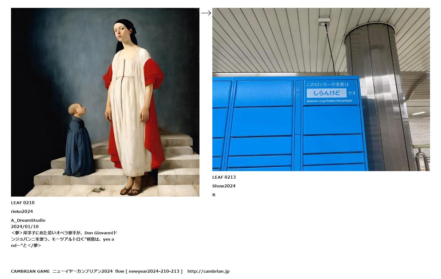 LEAF 0208フローに加えるLEAF 0210rieko2024A_DreamStudio 2024/01/10<夢>岸洋子に似た若いオペラ歌手が、Don Giovanniドンジョバンニを歌う、モーツアルト曰く”極意は、yes and…"と</夢>↑ここから上をフローから外す↓ここから下をフローから外すLEAF 0213Show2024R