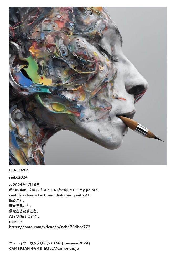LEAF 0058フローに加えるLEAF 0264rieko2024A 2024年1月16日 私の絵筆は、夢のテキスト+AIとの対話1 ーMy paintbrush is a dream text, and dialoguing with AI, 眠ること、夢を見ること、夢を書き記すこと、AIと対話すること、more…https://note.com/xrieko/n/ncb476dbac772LEAF 0267フローに加える