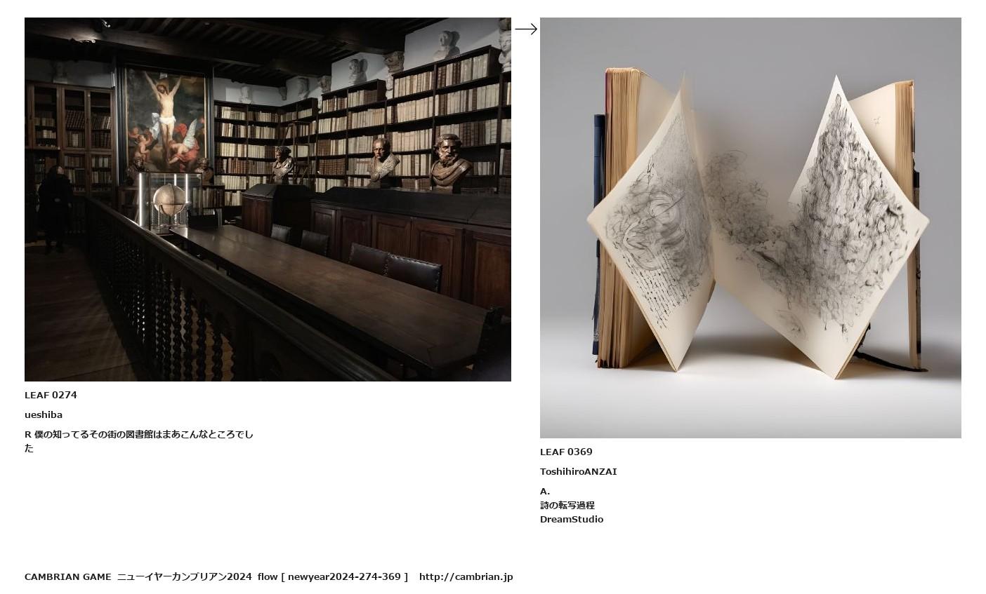 LEAF 0248フローに加えるLEAF 0274ueshibaR 僕の知ってるその街の図書館はまあこんなところでした↑ここから上をフローから外す↓ここから下をフローから外すLEAF 0369ToshihiroANZAIA.詩の転写過程DreamStudioLEAF 0443フローに加える