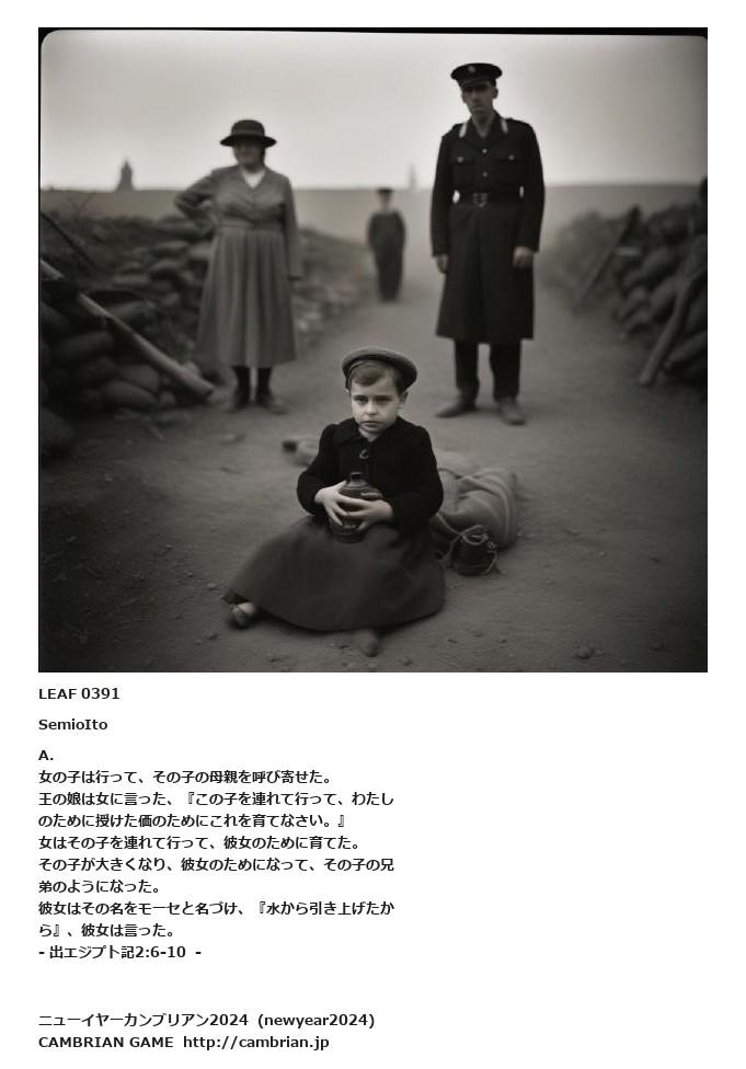 LEAF 0259フローに加えるLEAF 0391SemioItoA.女の子は行って、その子の母親を呼び寄せた。王の娘は女に言った、『この子を連れて行って、わたしのために授けた価のためにこれを育てなさい。』女はその子を連れて行って、彼女のために育てた。その子が大きくなり、彼女のためになって、その子の兄弟のようになった。彼女はその名をモーセと名づけ、『水から引き上げたから』、彼女は言った。- 出エジプト記2:6-10 -