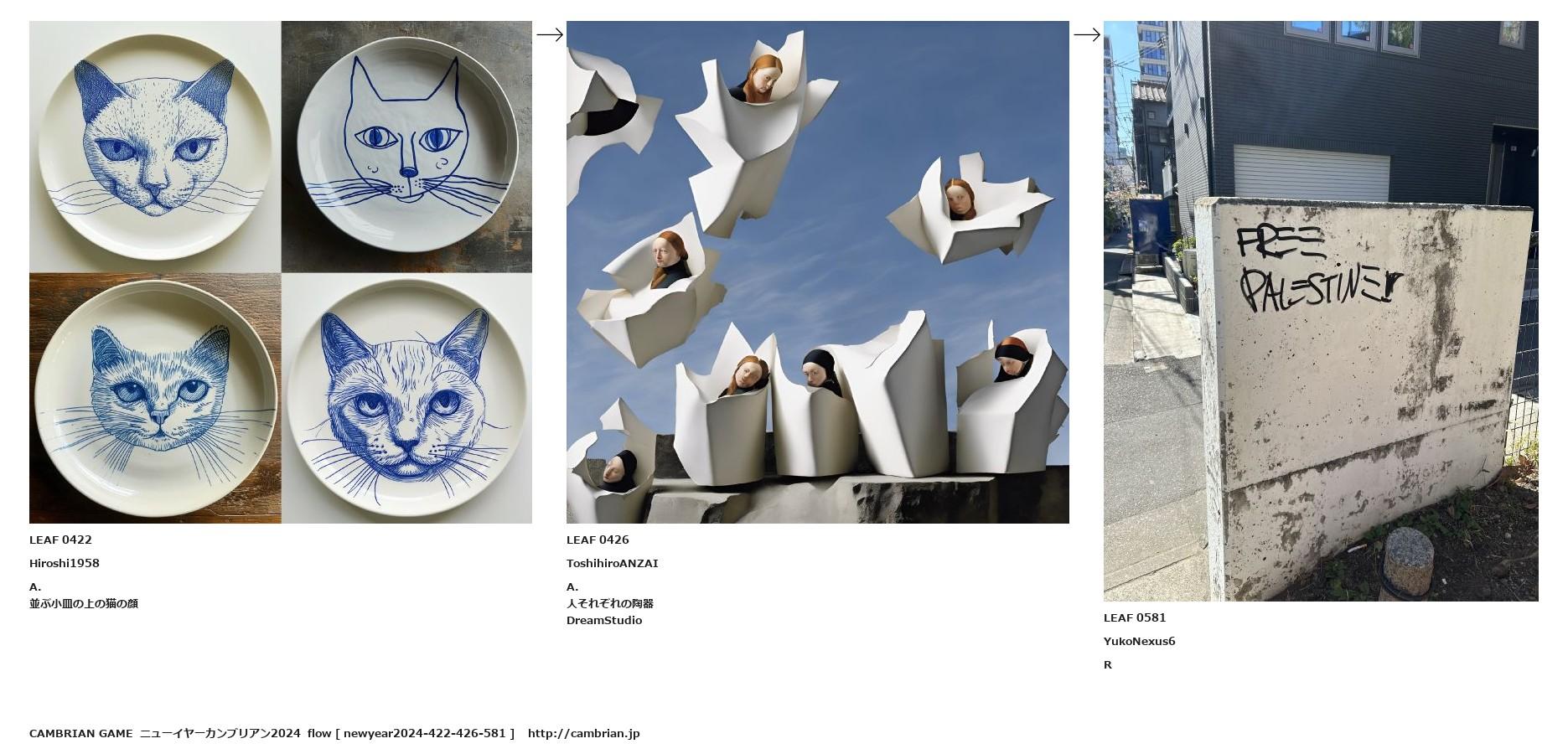 並ぶ小皿の上の猫の顔