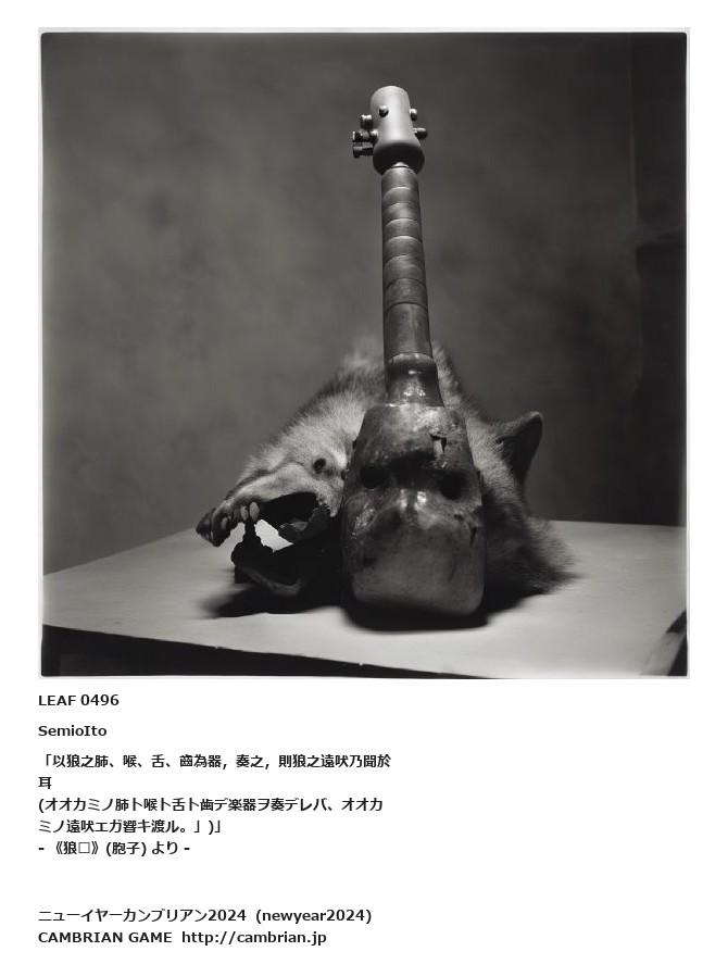 LEAF 0493フローに加えるLEAF 0496SemioIto「以狼之肺、喉、舌、齒為器,奏之,則狼之遠吠乃聞於耳(オオカミノ肺ト喉ト舌ト歯デ楽器ヲ奏デレバ、オオカミノ遠吠エガ響キ渡ル。」)」- 《狼嚎》(胞子) より -