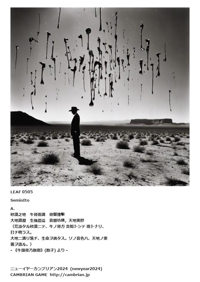 LEAF 0489フローに加えるLEAF 0505SemioItoA.砂漠之地 牛骨雨滴 骨聲撞擊大地濕潤 生機盈溢 音響彷彿,天地奧妙(荒涼タル砂漠ニテ、牛ノ骨ガ 突如トシテ 雨トナリ、打チ鳴ラス。大地ニ滴リ落チ、生命ヲ満タス。ソノ音色ハ、天地ノ奥義ヲ語ル。)- 《牛頭骨乃散雨》(胞子) より -LEAF 0508フローに加える