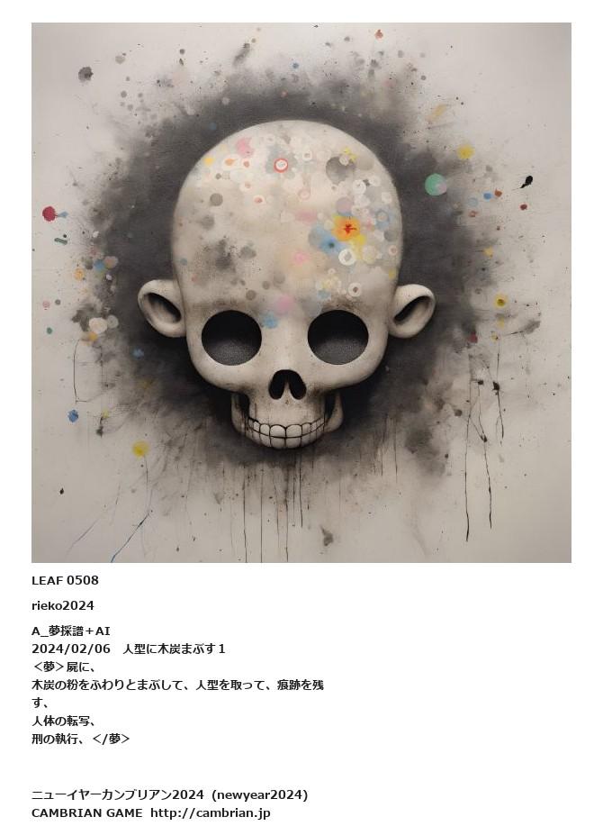LEAF 0505フローに加えるLEAF 0508rieko2024A_夢採譜+AI2024/02/06 人型に木炭まぶす1<夢>屍に、木炭の粉をふわりとまぶして、人型を取って、痕跡を残す、人体の転写、刑の執行、</夢>LEAF 0523フローに加える