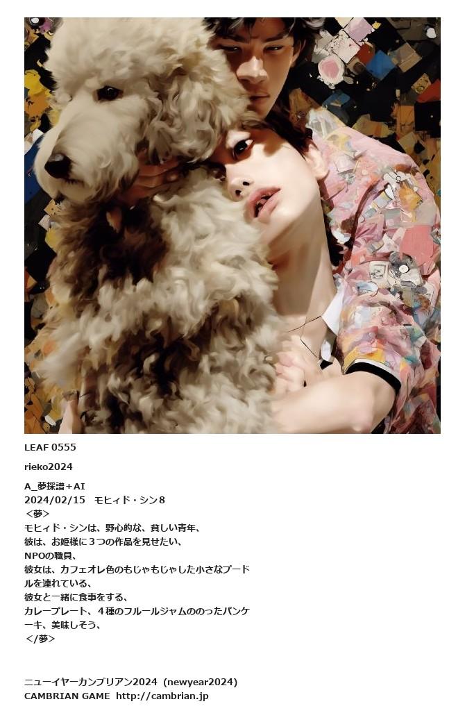 LEAF 0546フローに加えるLEAF 0555rieko2024A_夢採譜+AI2024/02/15 モヒィド・シン8<夢>モヒィド・シンは、野心的な、貧しい青年、彼は、お姫様に3つの作品を見せたい、NPOの職員、彼女は、カフェオレ色のもじゃもじゃした小さなプードルを連れている、彼女と一緒に食事をする、カレープレート、4種のフルールジャムののったパンケーキ、美味しそう、</夢>LEAF 0939フローに加える