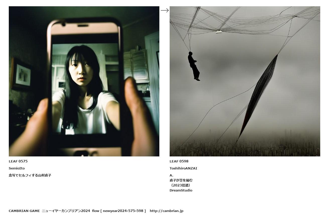 LEAF 0561フローに加えるLEAF 0575SemioIto念写でセルフィする山村貞子↑ここから上をフローから外す↓ここから下をフローから外すLEAF 0598ToshihiroANZAIA.貞子が空を編む(2023拾遺)DreamStudioLEAF 0905フローに加えるLEAF 0626フローに加える