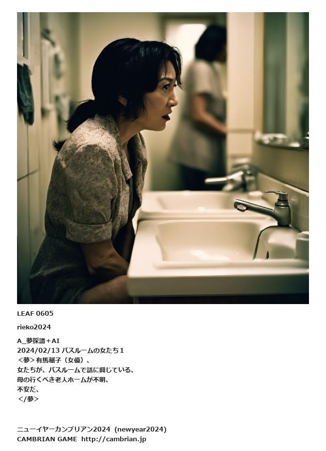 LEAF 0602フローに加えるLEAF 0605rieko2024A_夢採譜+AI2024/02/13 バスルームの女たち1<夢>有馬稲子(女優)、女たちが、バスルームで話に興じている、母の行くべき老人ホームが不明、不安だ、</夢>LEAF 0615フローに加える