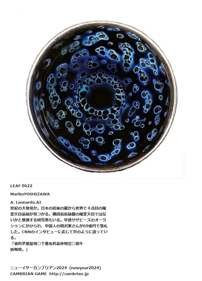 LEAF 0525フローに加えるLEAF 0622MarikoYOSHIZAWAA. Leonardo.AI世紀の大発見か。日本の旧家の蔵から世界で4点目の曜変天目茶碗が見つかる。織田信長秘蔵の曜変天目ではないかと推測する研究者もいる。早速サザビーズのオークションにかけられ、中国人の周沢東さんが69億円で落札した。CNNのインタビューに応じて次のように語っている。「我的梦想是用这个著名的茶杯喝豆浆和牛奶咖啡。」LEAF 0647フローに加えるLEAF 0640フローに加えるLEAF 0624フローに加える