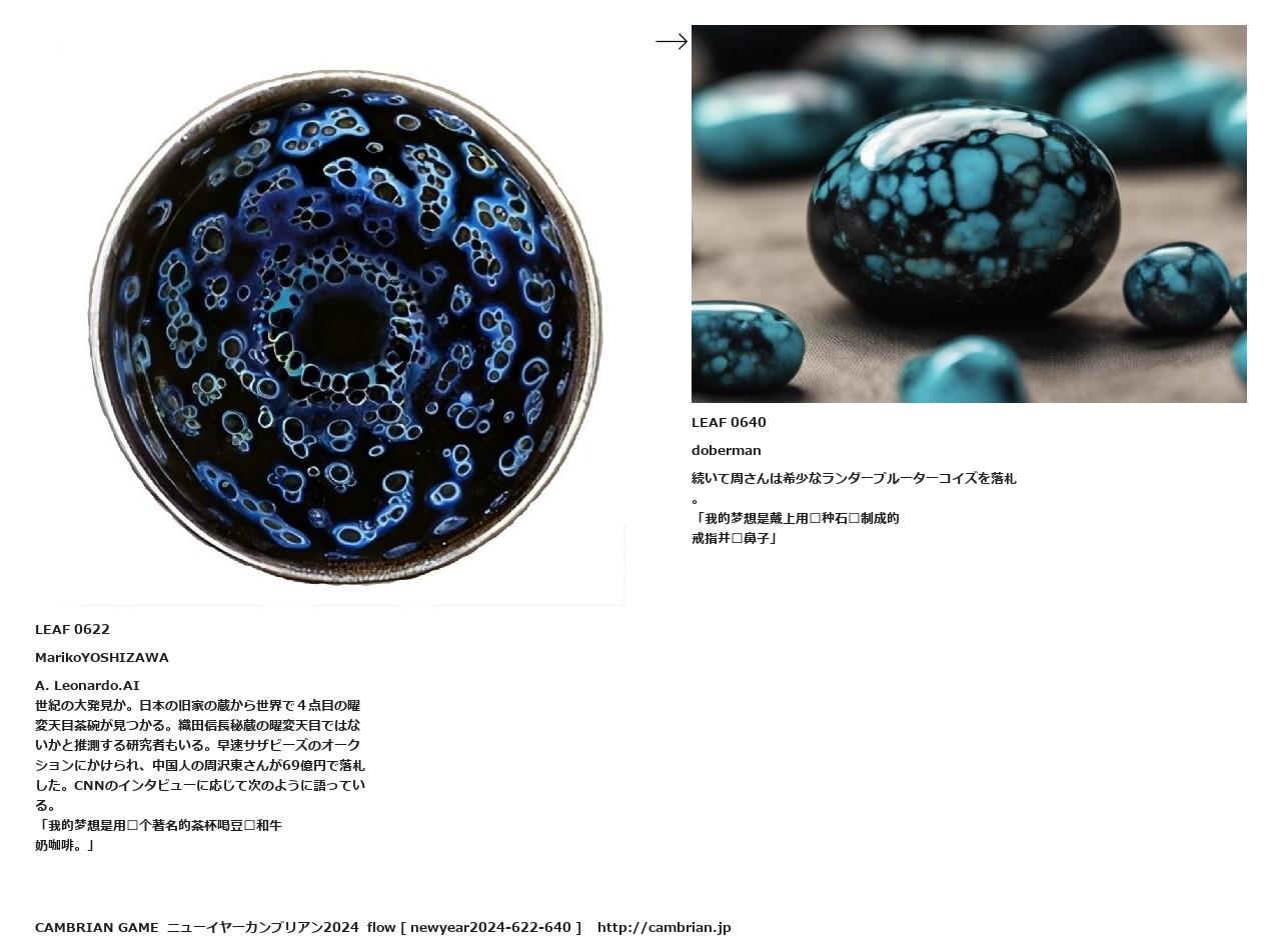 世紀の大発見か。日本の旧家の蔵から世界で4点目の曜変天目茶碗が見つかる。織田信長秘蔵の曜変天目ではないかと推測する研究者もいる。早速サザビーズのオークションにかけられ、中国人の周沢東さんが69億円で落札した。CNNのインタビューに応じて次のように語っている。