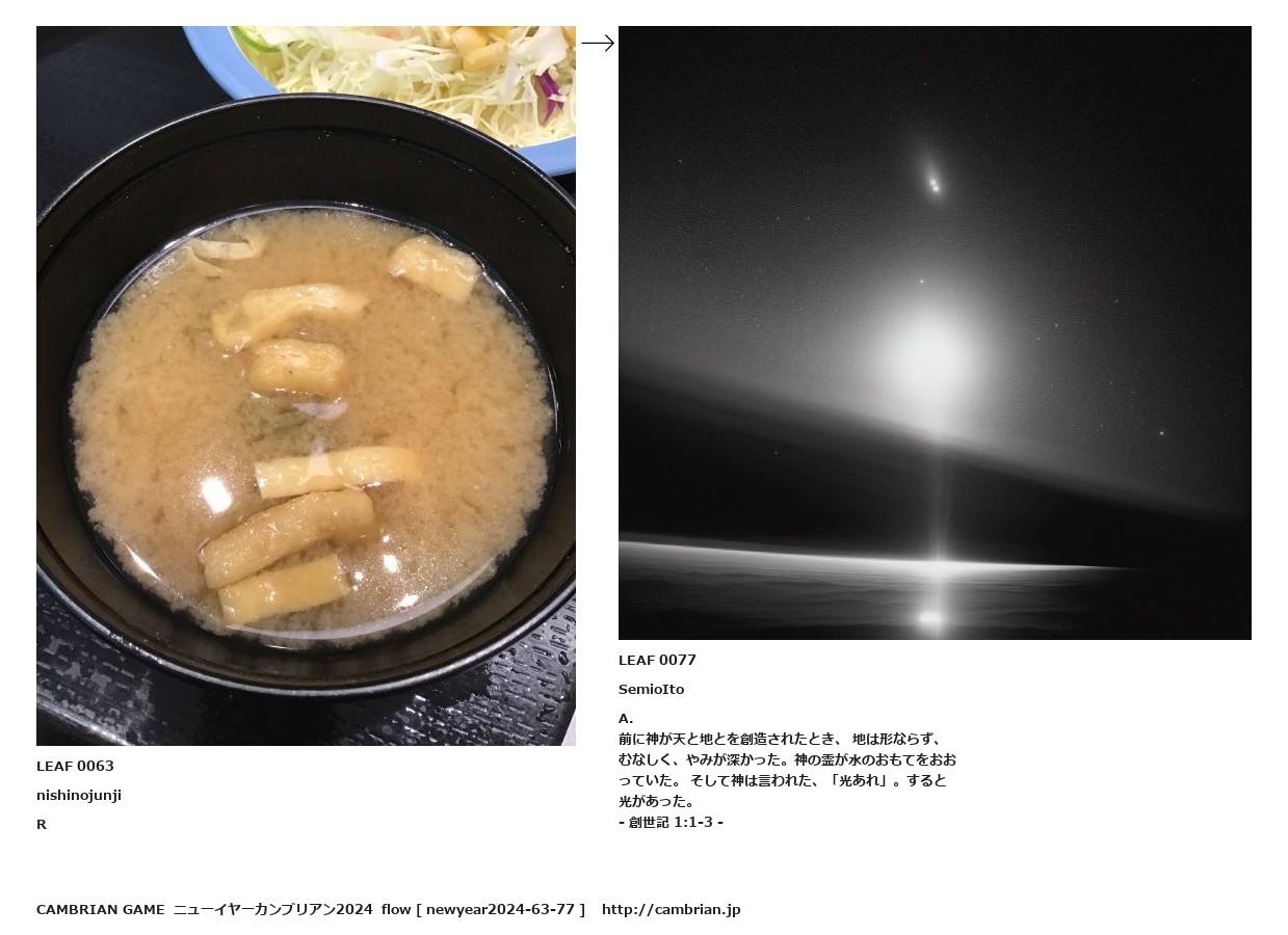 前に神が天と地とを創造されたとき、 地は形ならず、むなしく、やみが深かった。神の霊が水のおもてをおおっていた。 そして神は言われた、「光あれ」。すると光があった。