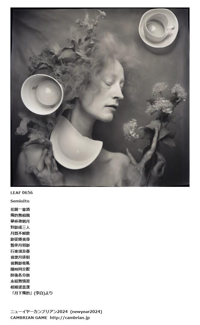LEAF 0416フローに加えるLEAF 0656SemioIto花間一壷酒獨酌無相親擧杯邀明月對影成三人月既不解飲影徒随我身暫伴月将影行楽須及春我歌月徘徊我舞影零亂醒時同交歡醉後各分散永結無情遊相期遥雲漢「月下獨酌」(李白)よりLEAF 0667フローに加える