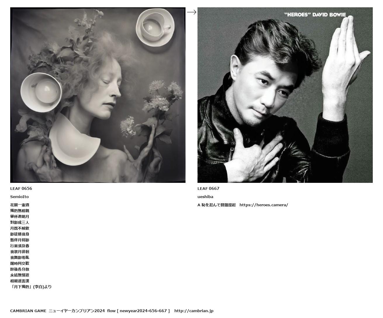 LEAF 0416フローに加えるLEAF 0656SemioIto花間一壷酒獨酌無相親擧杯邀明月對影成三人月既不解飲影徒随我身暫伴月将影行楽須及春我歌月徘徊我舞影零亂醒時同交歡醉後各分散永結無情遊相期遥雲漢「月下獨酌」(李白)より↑ここから上をフローから外す↓ここから下をフローから外すLEAF 0667ueshibaA 恥を忍んで問題提起 https://heroes.camera/LEAF 1108フローに加えるLEAF 0965フローに加えるLEAF 0863フローに加えるLEAF 0718フローに加える