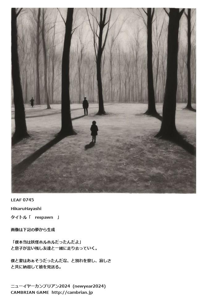 LEAF 0742フローに加えるLEAF 0745HikaruHayashiタイトル「 respawn 」画像は下記の夢から生成「僕本当は妖怪ホルホルだったんだよ」と息子が言い残し友達と一緒に走り去っていく。僕と妻はあぁそうだったんだな、と別れを察し、寂しさと共に納得して彼を見送る。LEAF 0770フローに加える