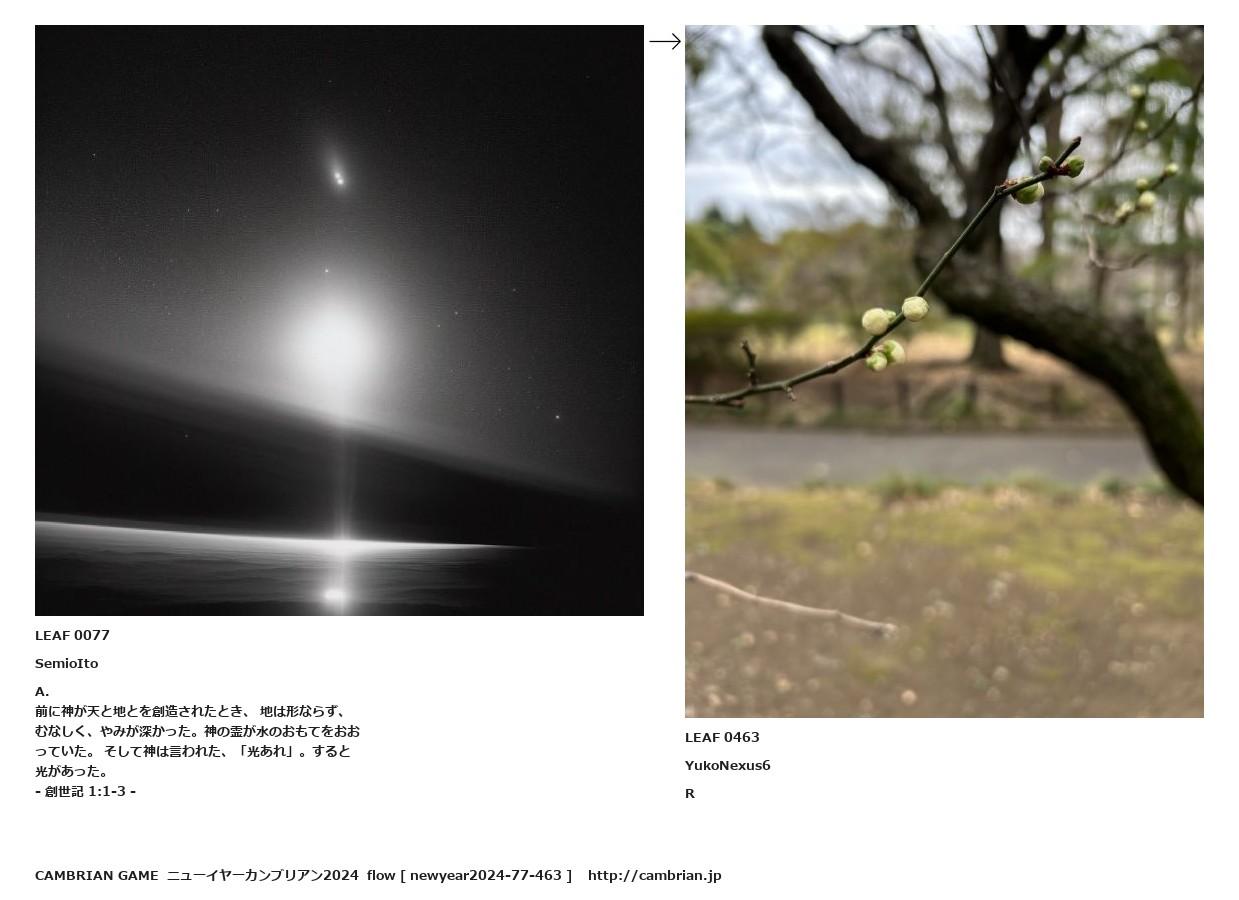 前に神が天と地とを創造されたとき、 地は形ならず、むなしく、やみが深かった。神の霊が水のおもてをおおっていた。 そして神は言われた、「光あれ」。すると光があった。
