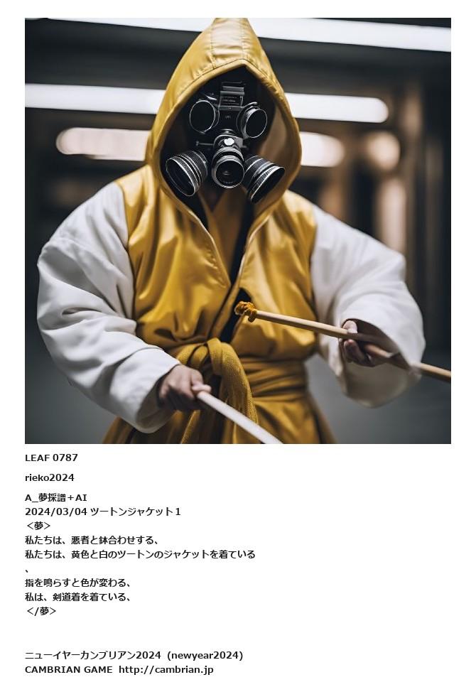 LEAF 0784フローに加えるLEAF 0787rieko2024A_夢採譜+AI 2024/03/04 ツートンジャケット1<夢>私たちは、悪者と鉢合わせする、私たちは、黄色と白のツートンのジャケットを着ている、指を鳴らすと色が変わる、私は、剣道着を着ている、</夢>LEAF 0798フローに加える