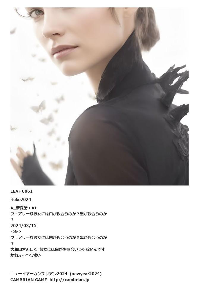 LEAF 0852フローに加えるLEAF 0861rieko2024A_夢採譜+AIフェアリーな彼女には白が似合うのか?黒が似合うのか?2024/03/15<夢>フェアリーな彼女には白が似合うのか?黒が似合うのか?大和田さん曰く”彼女には白がお似合いじゃないんですかねえ…”</夢>LEAF 0918フローに加えるLEAF 0868フローに加える