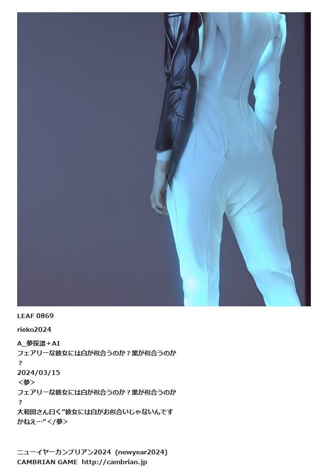 LEAF 0809フローに加えるLEAF 0869rieko2024A_夢採譜+AIフェアリーな彼女には白が似合うのか?黒が似合うのか?2024/03/15<夢>フェアリーな彼女には白が似合うのか?黒が似合うのか?大和田さん曰く”彼女には白がお似合いじゃないんですかねえ…”</夢>
