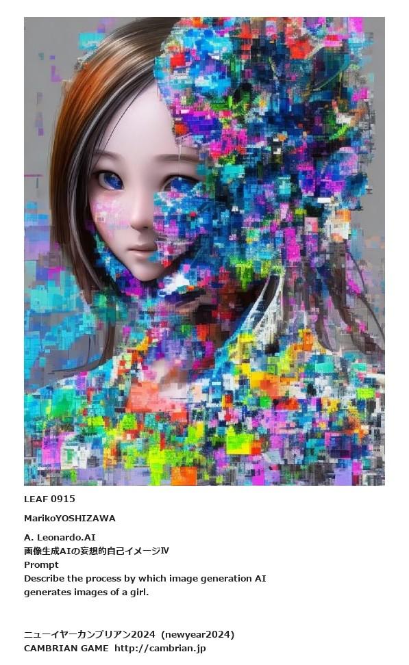 LEAF 0560フローに加えるLEAF 0915MarikoYOSHIZAWAA. Leonardo.AI画像生成AIの妄想的自己イメージⅣPromptDescribe the process by which image generation AI generates images of a girl.LEAF 0930フローに加えるLEAF 0920フローに加える