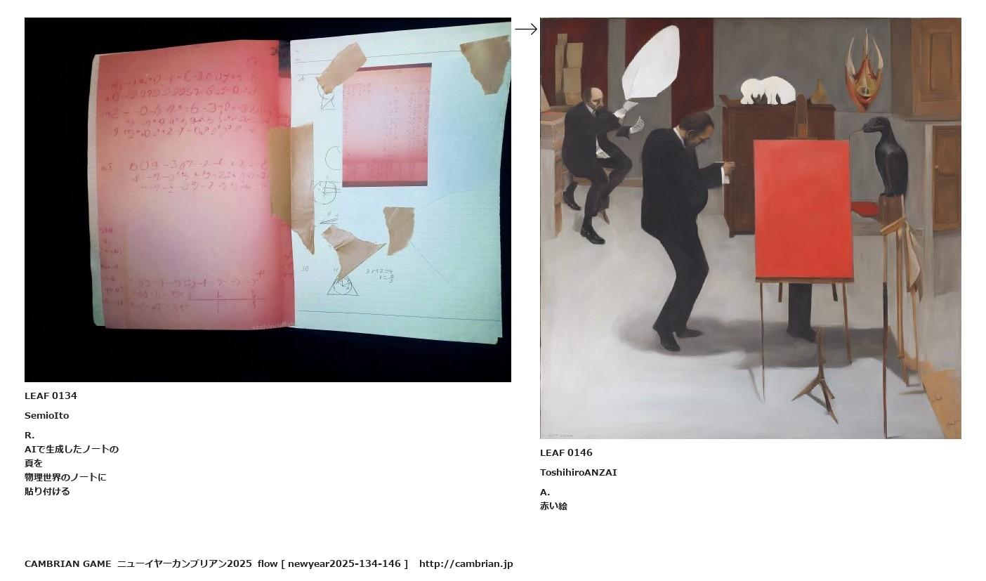 LEAF 0035フローに加えるLEAF 0134SemioItoR.AIで生成したノートの頁を物理世界のノートに貼り付ける↑ここから上をフローから外す↓ここから下をフローから外すLEAF 0146ToshihiroANZAIA.赤い絵LEAF 0184フローに加えるLEAF 0147フローに加える