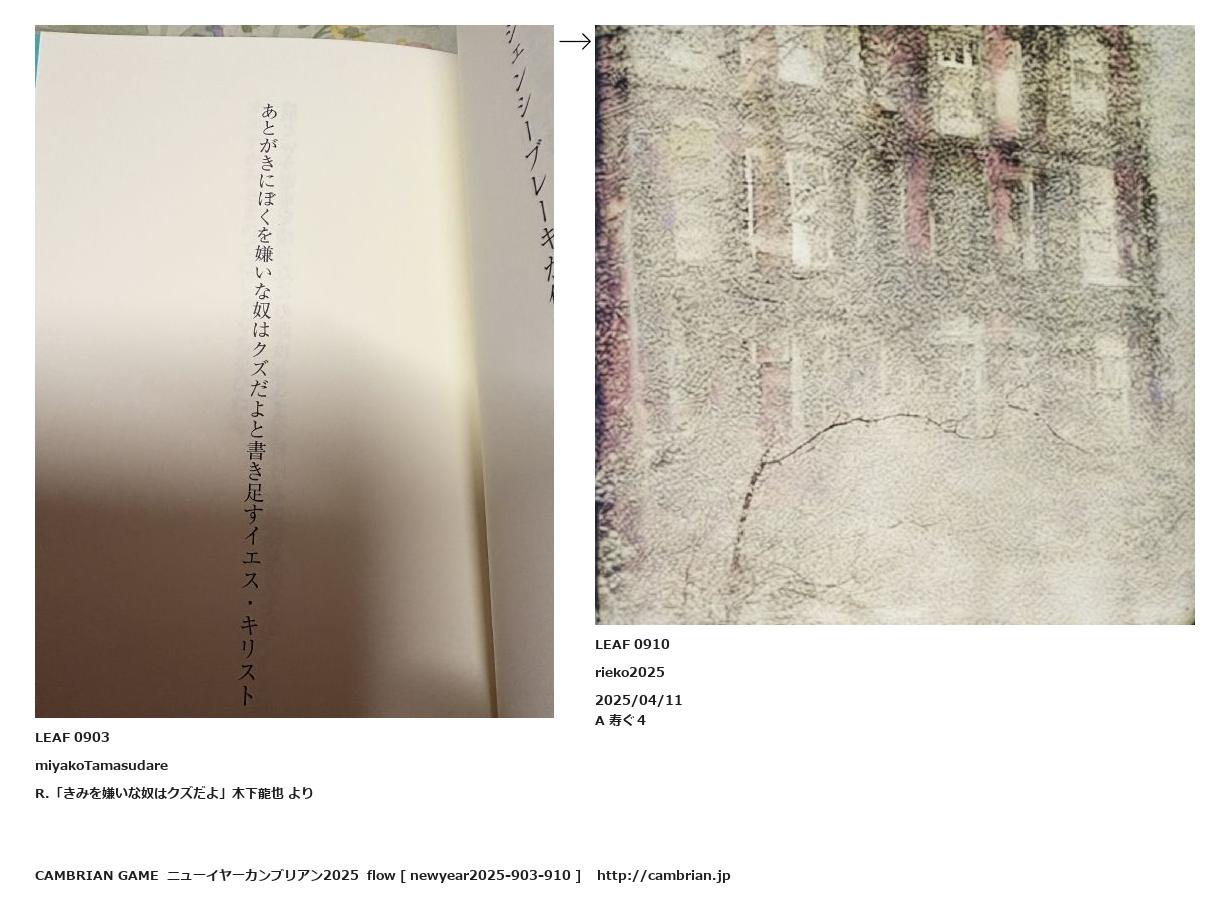 LEAF 0853フローに加えるLEAF 0903miyakoTamasudareR.「きみを嫌いな奴はクズだよ」木下龍也 より↑ここから上をフローから外す↓ここから下をフローから外すLEAF 0910rieko20252025/04/11A 寿ぐ4