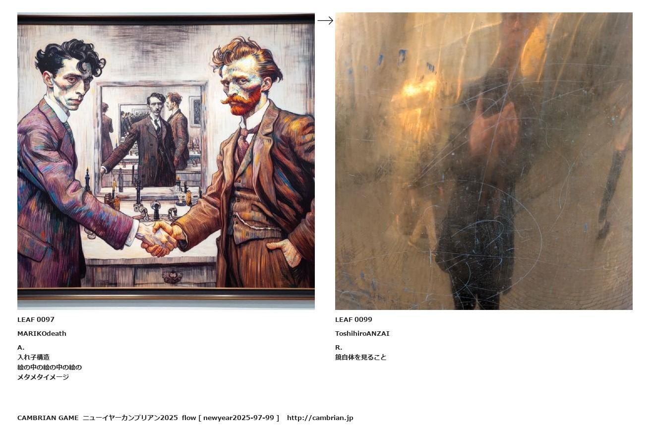 LEAF 0083フローに加えるLEAF 0097MARIKOdeathA.入れ子構造絵の中の絵の中の絵のメタメタイメージ↑ここから上をフローから外す↓ここから下をフローから外すLEAF 0099ToshihiroANZAIR.鏡自体を見ることLEAF 0869フローに加えるLEAF 0128フローに加えるLEAF 0105フローに加える