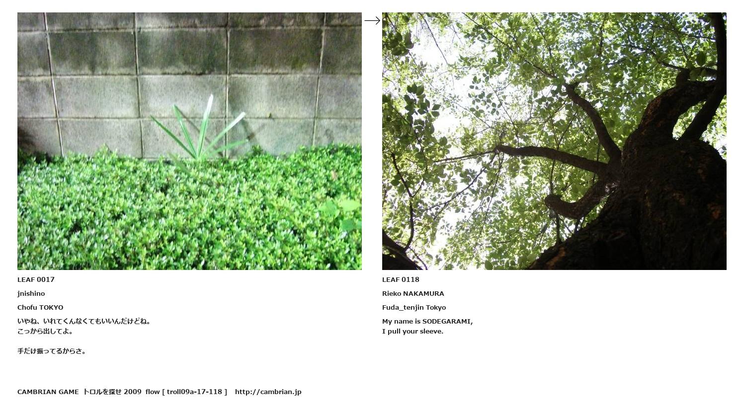 LEAF 0013フローに加えるLEAF 0017jnishinoChofu TOKYOいやね、いれてくんなくてもいいんだけどね。こっから出してよ。手だけ振ってるからさ。↑ここから上をフローから外す↓ここから下をフローから外すLEAF 0118Rieko NAKAMURAFuda_tenjin TokyoMy name is SODEGARAMI, I pull your sleeve. LEAF 0283フローに加えるLEAF 0128フローに加えるLEAF 0120フローに加える