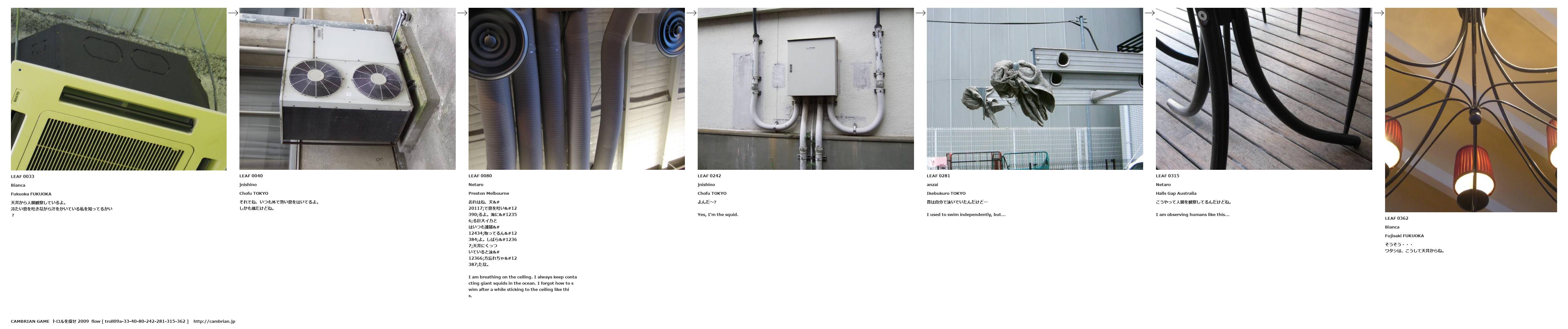 おれはね、天井で息を吐いてるよ。海にいる巨大イカとはいつも連絡を取ってるんだよ。しばらく天井にくっついていると泳ぎ方忘れちゃったな。