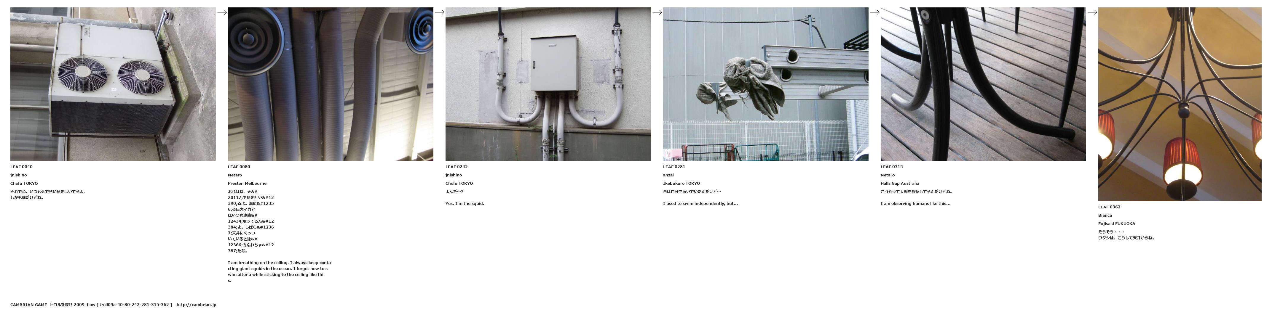 おれはね、天井で息を吐いてるよ。海にいる巨大イカとはいつも連絡を取ってるんだよ。しばらく天井にくっついていると泳ぎ方忘れちゃったな。