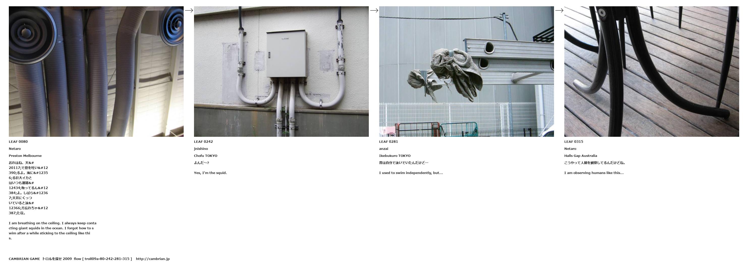 おれはね、天井で息を吐いてるよ。海にいる巨大イカとはいつも連絡を取ってるんだよ。しばらく天井にくっついていると泳ぎ方忘れちゃったな。