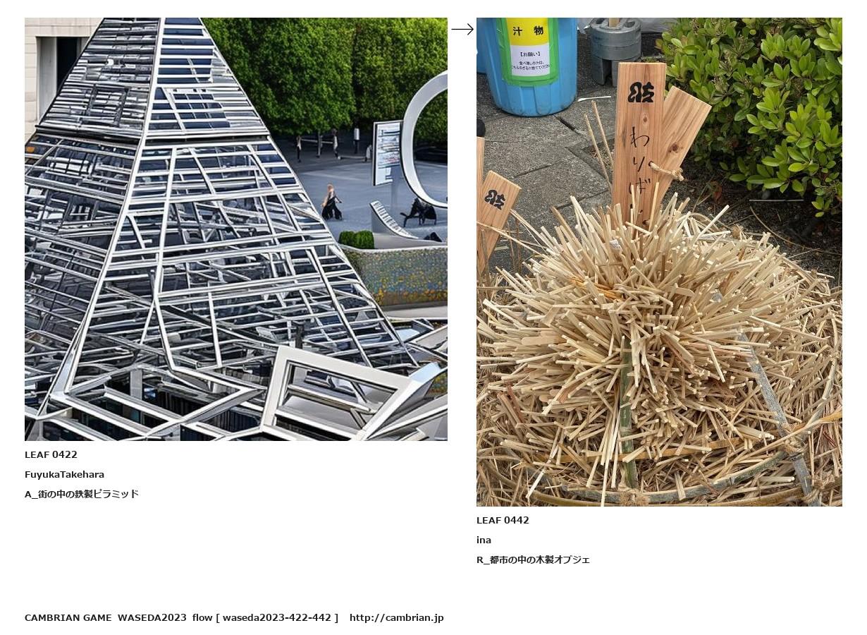 LEAF 0392フローに加えるLEAF 0422FuyukaTakeharaA_街の中の鉄製ピラミッド↑ここから上をフローから外す↓ここから下をフローから外すLEAF 0442inaR_都市の中の木製オブジェLEAF 0449フローに加える