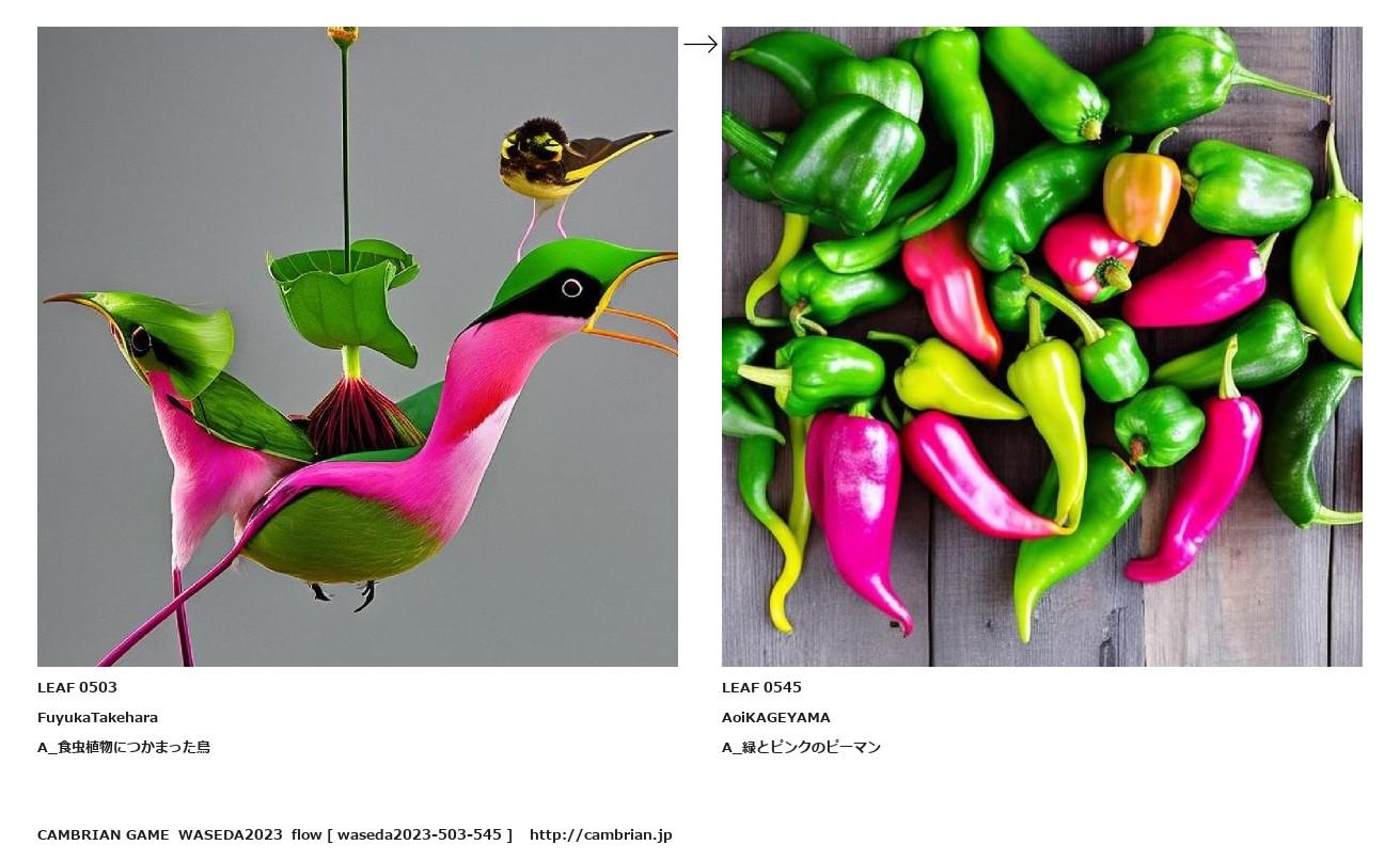 LEAF 0494フローに加えるLEAF 0503FuyukaTakeharaA_食虫植物につかまった鳥↑ここから上をフローから外す↓ここから下をフローから外すLEAF 0545AoiKAGEYAMAA_緑とピンクのピーマン