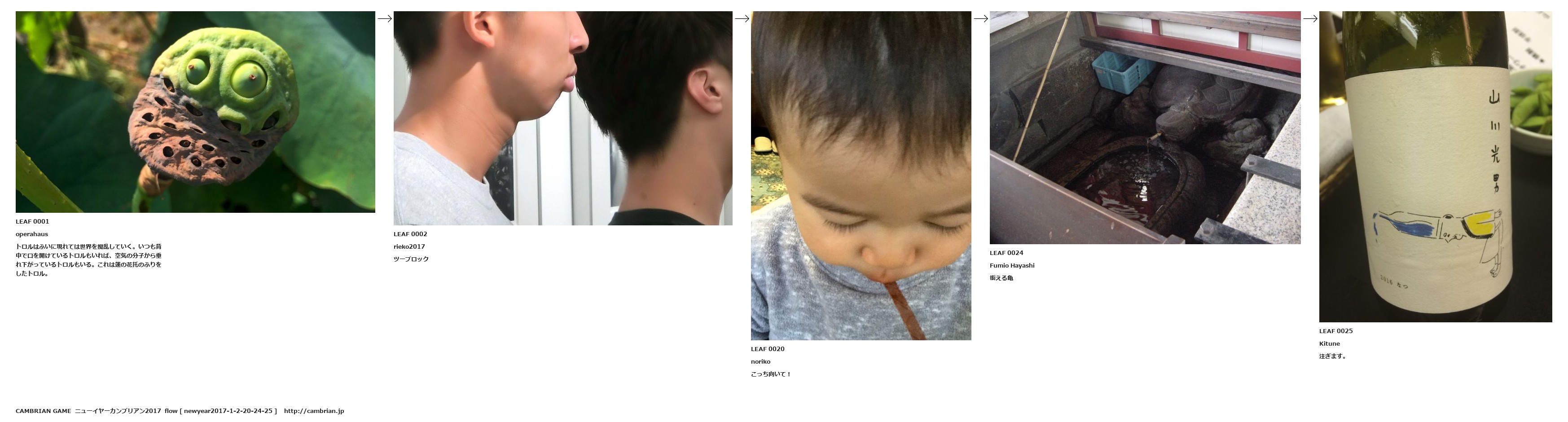 LEAF 0001operahausトロルはふいに現れては世界を撹乱していく。いつも背中で口を開けているトロルもいれば、空気の分子から垂れ下がっているトロルもいる。これは蓮の花托のふりをしたトロル。LEAF 0002rieko2017ツーブロックLEAF 0020norikoこっち向いて!LEAF 0024Fumio Hayashi銜える亀LEAF 0025Kitune注ぎます。