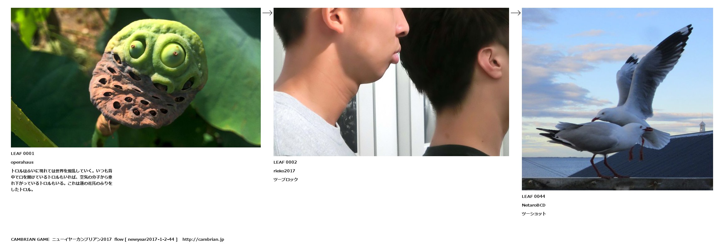 LEAF 0001operahausトロルはふいに現れては世界を撹乱していく。いつも背中で口を開けているトロルもいれば、空気の分子から垂れ下がっているトロルもいる。これは蓮の花托のふりをしたトロル。LEAF 0002rieko2017ツーブロックLEAF 0044NetaroBCDツーショット