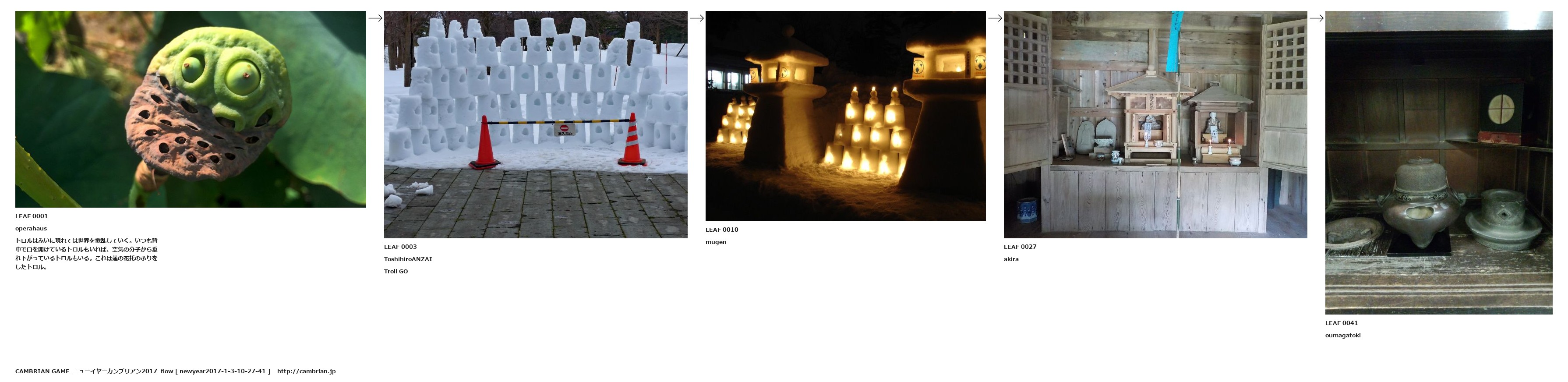 LEAF 0001operahausトロルはふいに現れては世界を撹乱していく。いつも背中で口を開けているトロルもいれば、空気の分子から垂れ下がっているトロルもいる。これは蓮の花托のふりをしたトロル。LEAF 0003ToshihiroANZAITroll GOLEAF 0010mugenLEAF 0027akiraLEAF 0041oumagatoki