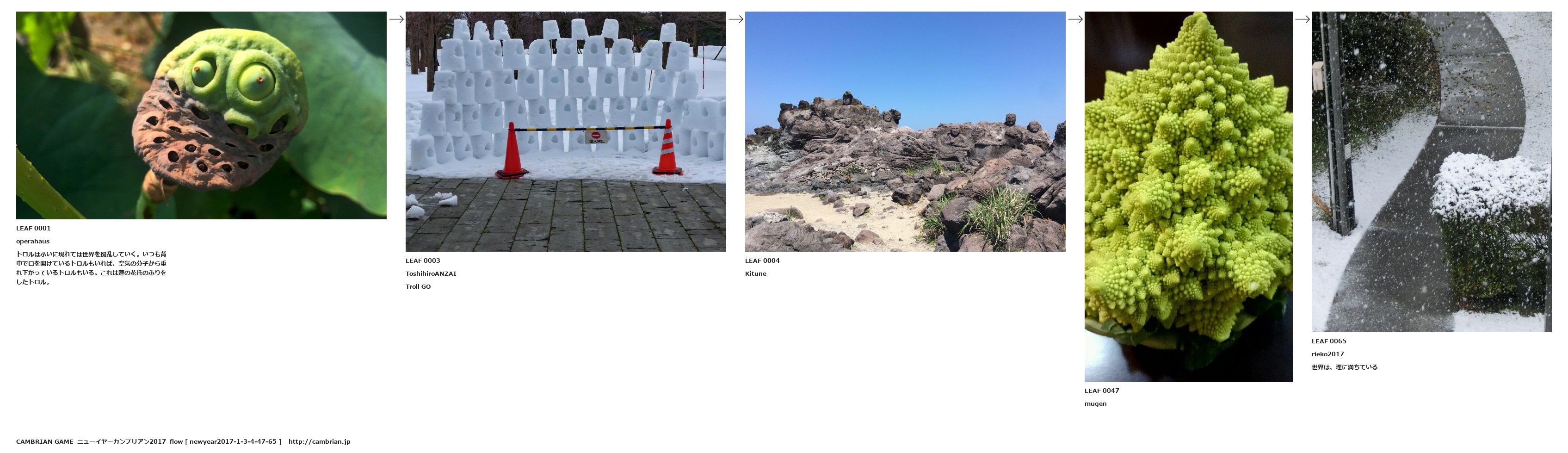 LEAF 0001operahausトロルはふいに現れては世界を撹乱していく。いつも背中で口を開けているトロルもいれば、空気の分子から垂れ下がっているトロルもいる。これは蓮の花托のふりをしたトロル。LEAF 0003ToshihiroANZAITroll GOLEAF 0004KituneLEAF 0047mugenLEAF 0065rieko2017世界は、理に満ちている
