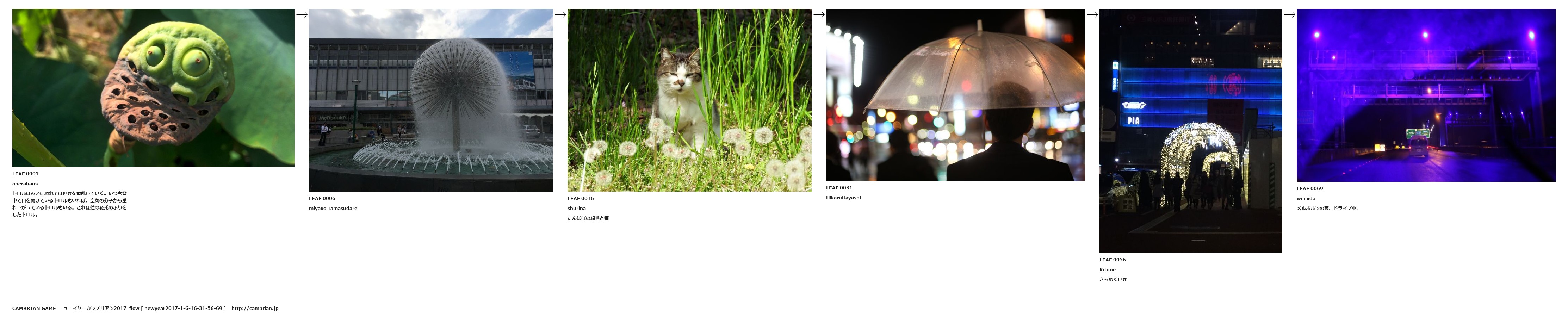 LEAF 0001operahausトロルはふいに現れては世界を撹乱していく。いつも背中で口を開けているトロルもいれば、空気の分子から垂れ下がっているトロルもいる。これは蓮の花托のふりをしたトロル。LEAF 0006miyako TamasudareLEAF 0016shurinaたんぽぽの綿毛と猫LEAF 0031HikaruHayashiLEAF 0056Kituneきらめく世界LEAF 0069wiiiiiidaメルボルンの夜、ドライブ中。