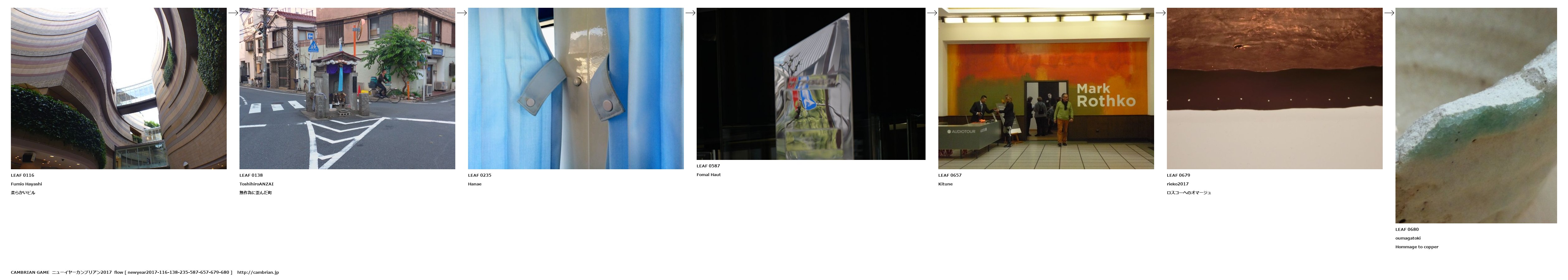 LEAF 0116Fumio Hayashi柔らかいビルLEAF 0138ToshihiroANZAI無作為に歪んだ町LEAF 0235HanaeLEAF 0587Fomal HautLEAF 0657KituneLEAF 0679rieko2017ロスコ―へのオマージュLEAF 0680oumagatokiHommage to copper