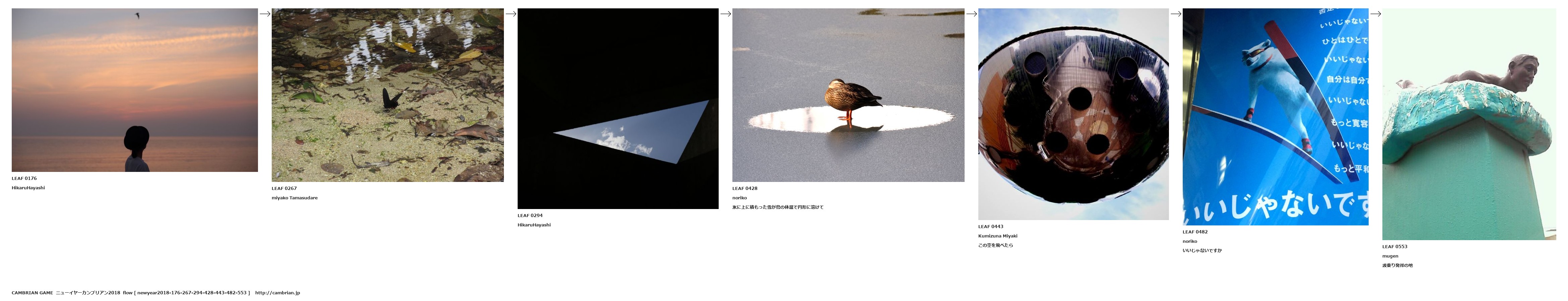 LEAF 0176HikaruHayashiLEAF 0267miyako TamasudareLEAF 0294HikaruHayashiLEAF 0428noriko氷に上に積もった雪が鳥の体温で円形に溶けてLEAF 0443Kumizuna Miyakiこの空を飛べたらLEAF 0482norikoいいじゃないですかLEAF 0553mugen波乗り発祥の地