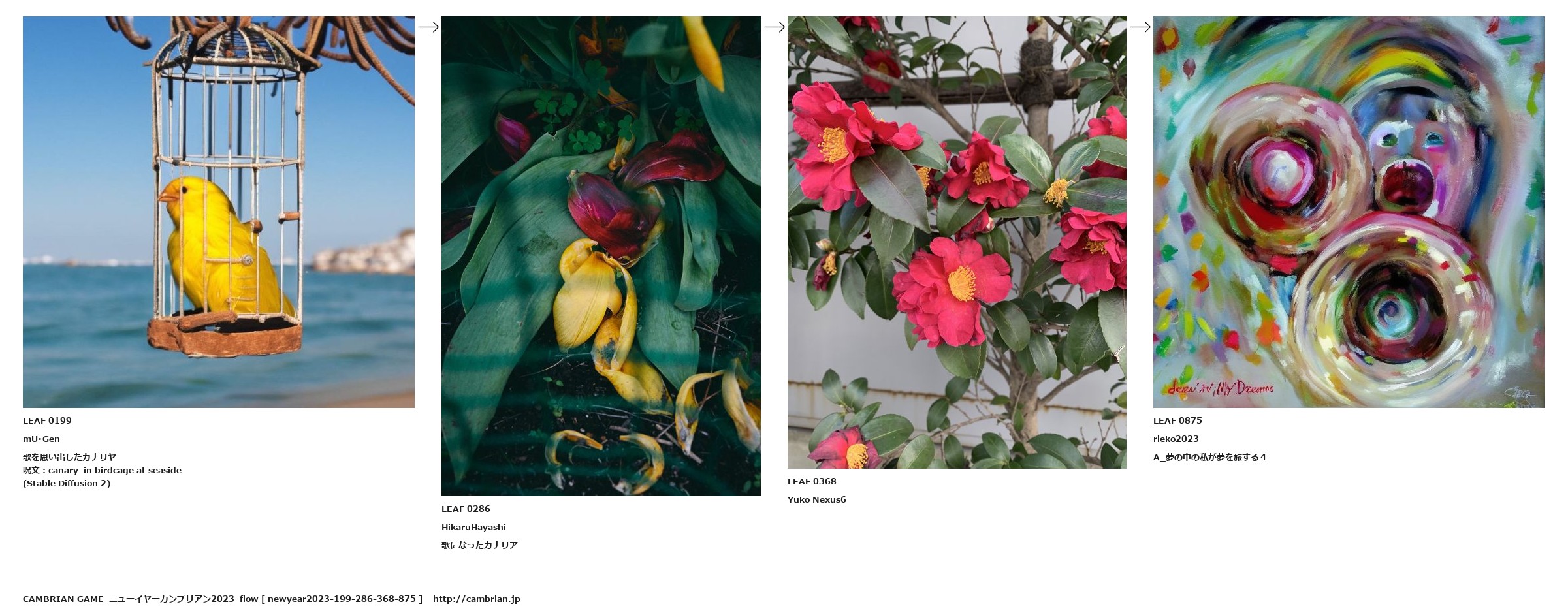 LEAF 0199mU・Gen歌を思い出したカナリヤ呪文:canary in birdcage at seaside(Stable Diffusion 2)LEAF 0286HikaruHayashi歌になったカナリアLEAF 0368Yuko Nexus6LEAF 0875rieko2023A_夢の中の私が夢を旅する4