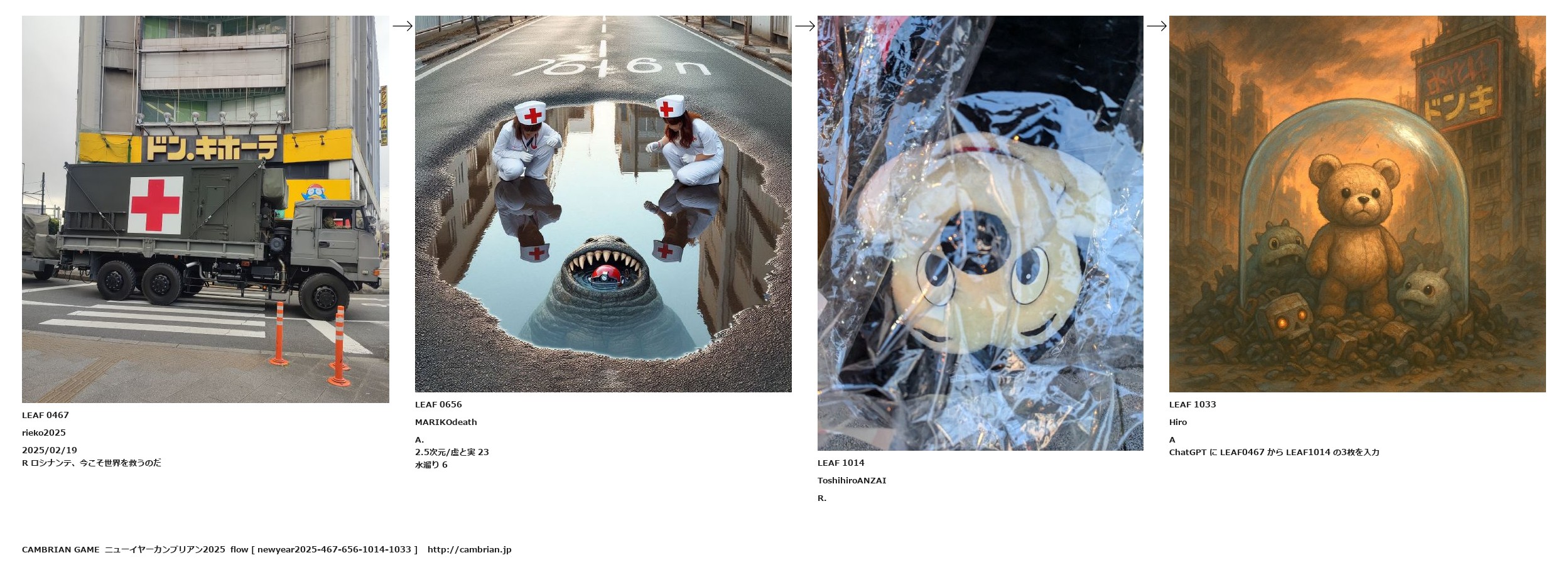 LEAF 0467rieko20252025/02/19R ロシナンテ、今こそ世界を救うのだLEAF 0656MARIKOdeathA. 2.5次元/虚と実 23水溜り 6LEAF 1014ToshihiroANZAIR.LEAF 1033HiroAChatGPT に LEAF0467 から LEAF1014 の3枚を入力