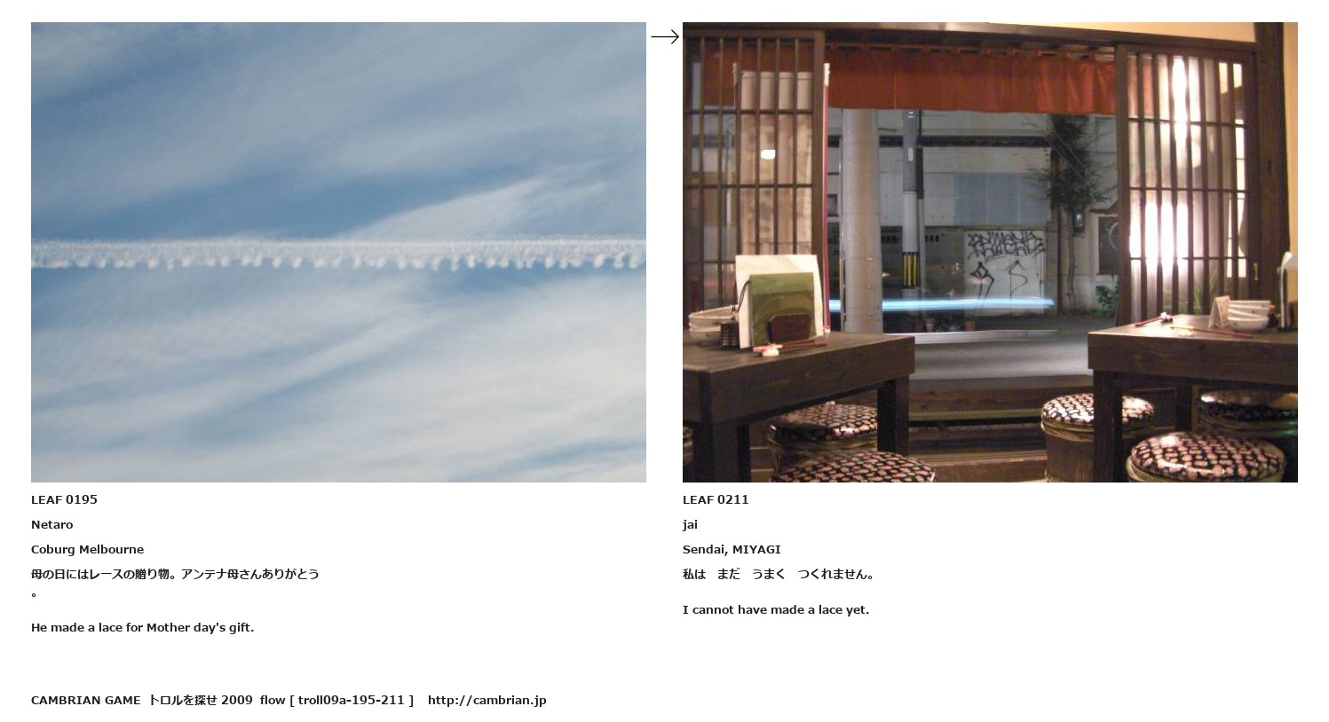 LEAF 0195NetaroCoburg Melbourne母の日にはレースの贈り物。アンテナ母さんありがとう。He made a lace for Mother day's gift.LEAF 0211jaiSendai, MIYAGI私は まだ うまく つくれません。I cannot have made a lace yet.