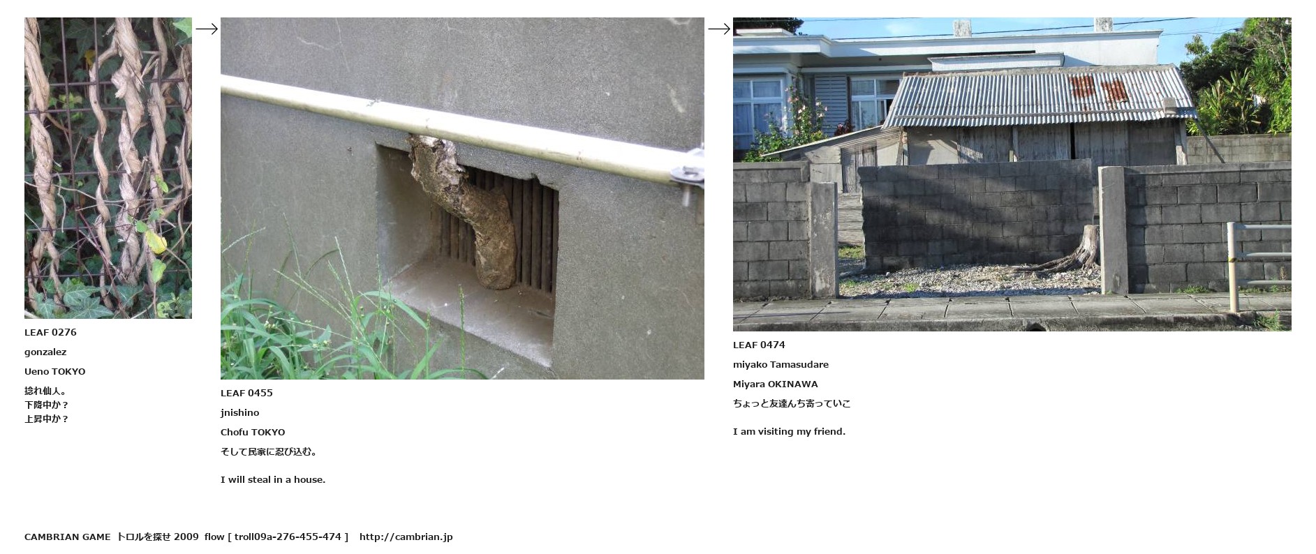 LEAF 0276gonzalezUeno TOKYO捻れ仙人。下降中か?上昇中か?LEAF 0455jnishinoChofu TOKYOそして民家に忍び込む。I will steal in a house.LEAF 0474miyako TamasudareMiyara OKINAWAちょっと友達んち寄っていこI am visiting my friend.