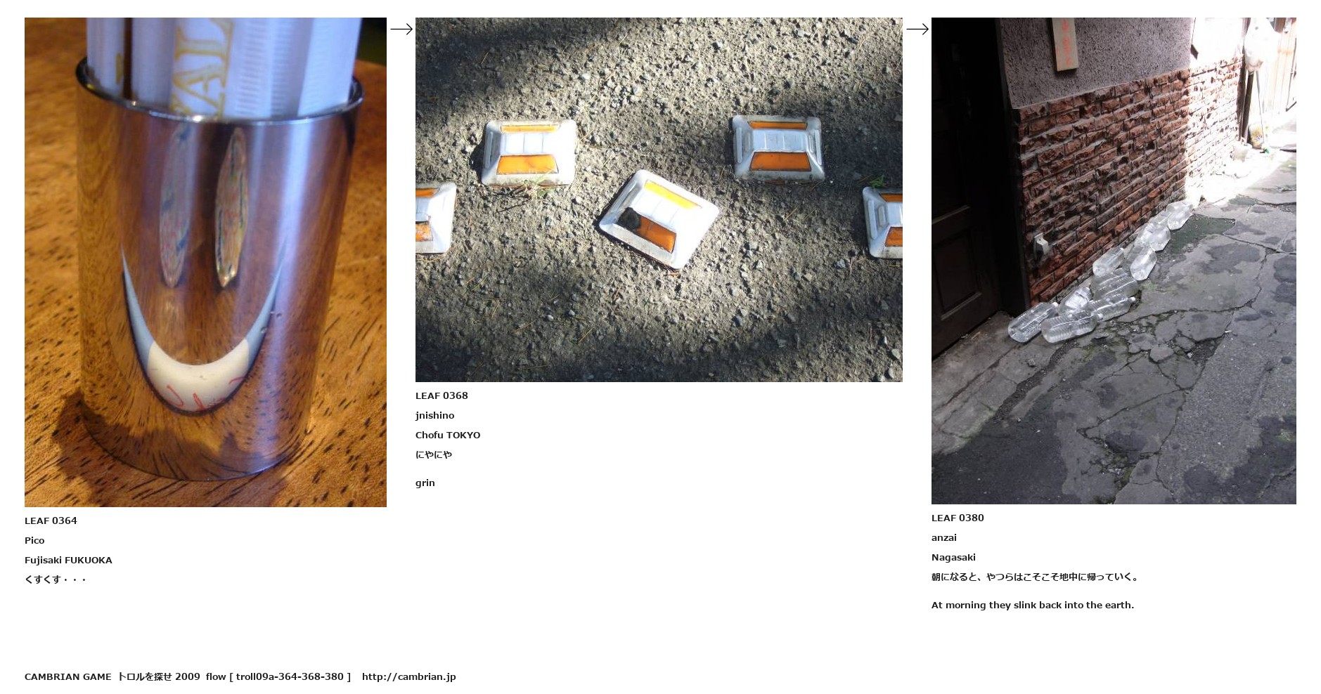 LEAF 0364PicoFujisaki FUKUOKAくすくす・・・LEAF 0368jnishinoChofu TOKYOにやにやgrinLEAF 0380anzaiNagasaki朝になると、やつらはこそこそ地中に帰っていく。At morning they slink back into the earth.